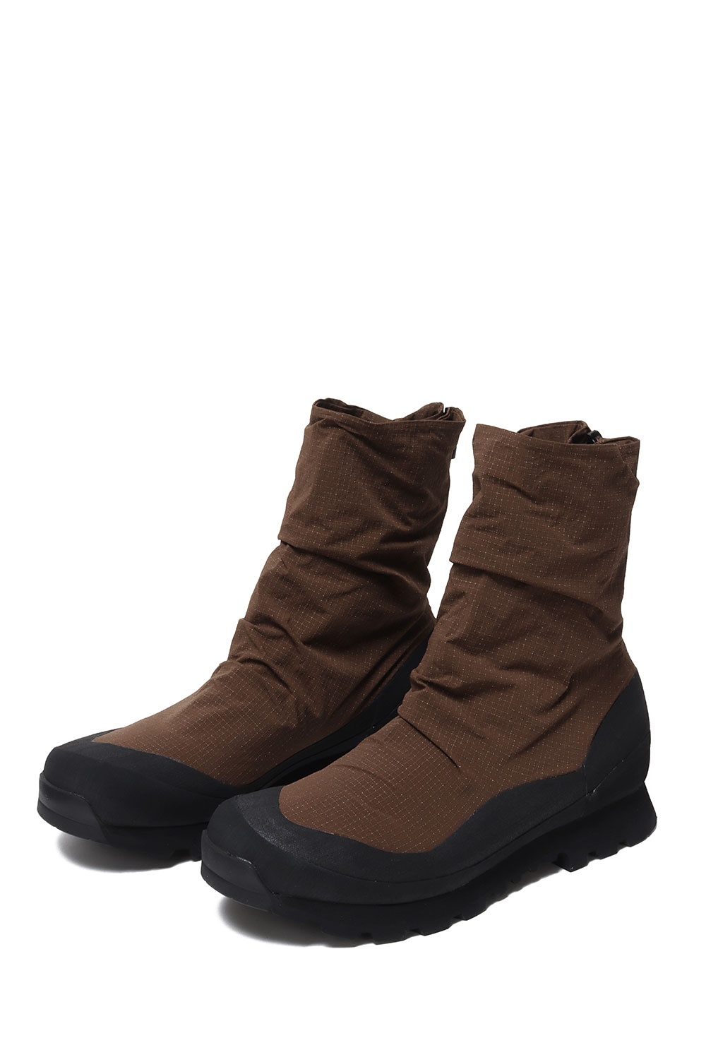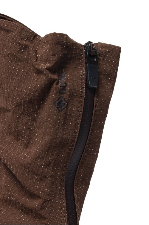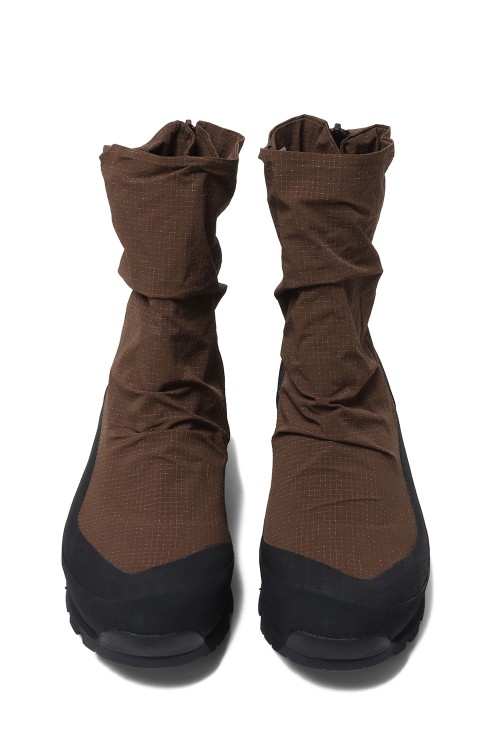 着脱をスムーズにする後ろ足首にあるバックファスナーは、雨水や砂利などの浸入を軽減するガゼット構造です。