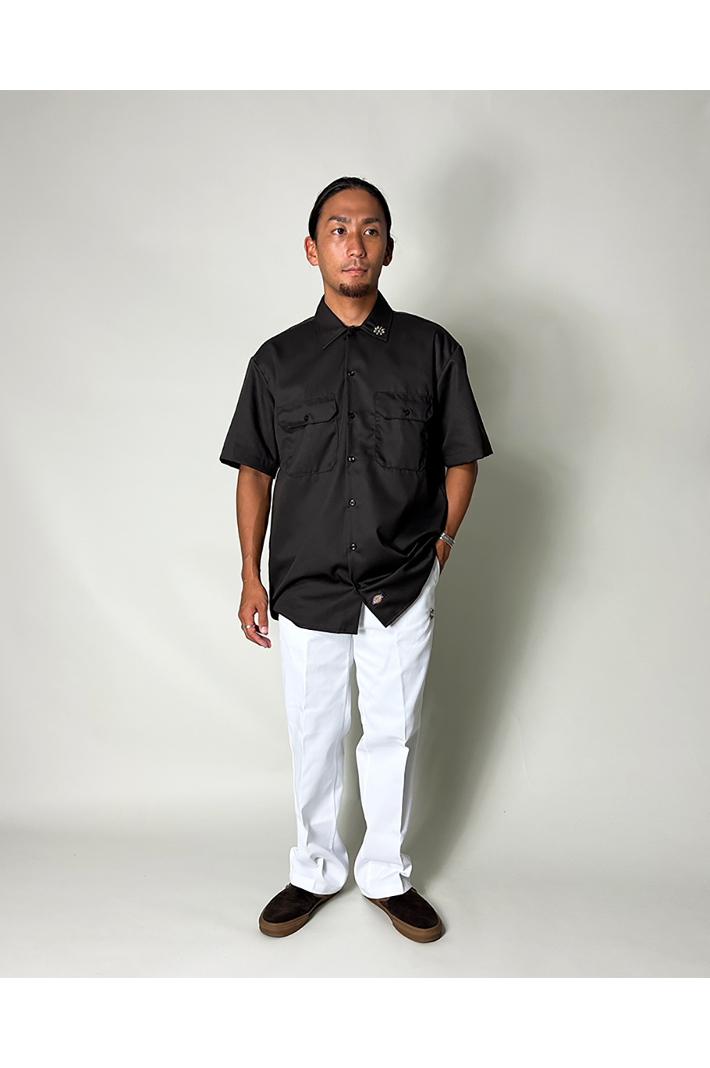 USA Dickiesのワークシャツをベースに、フラワーデザインのスタッズを打ち込んでいます。
