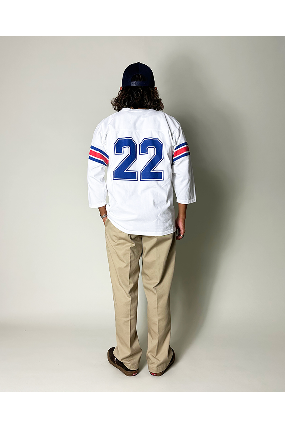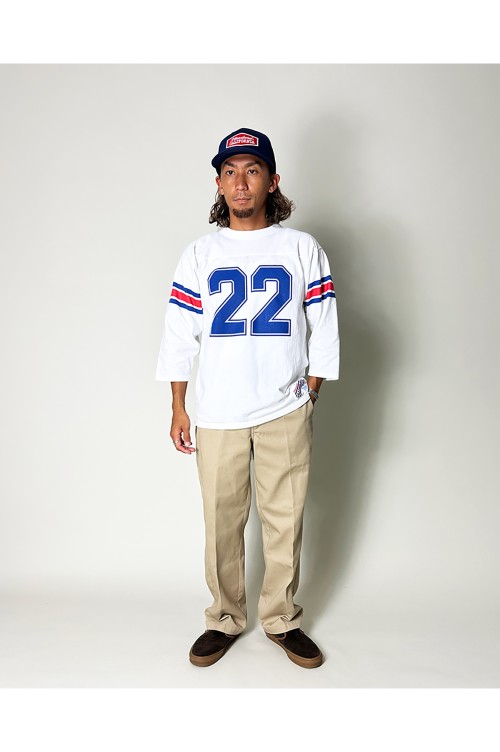 フットボールTらしい袖の配色プリントや、前後の大きなナンバリングプリントが目を惹きます。