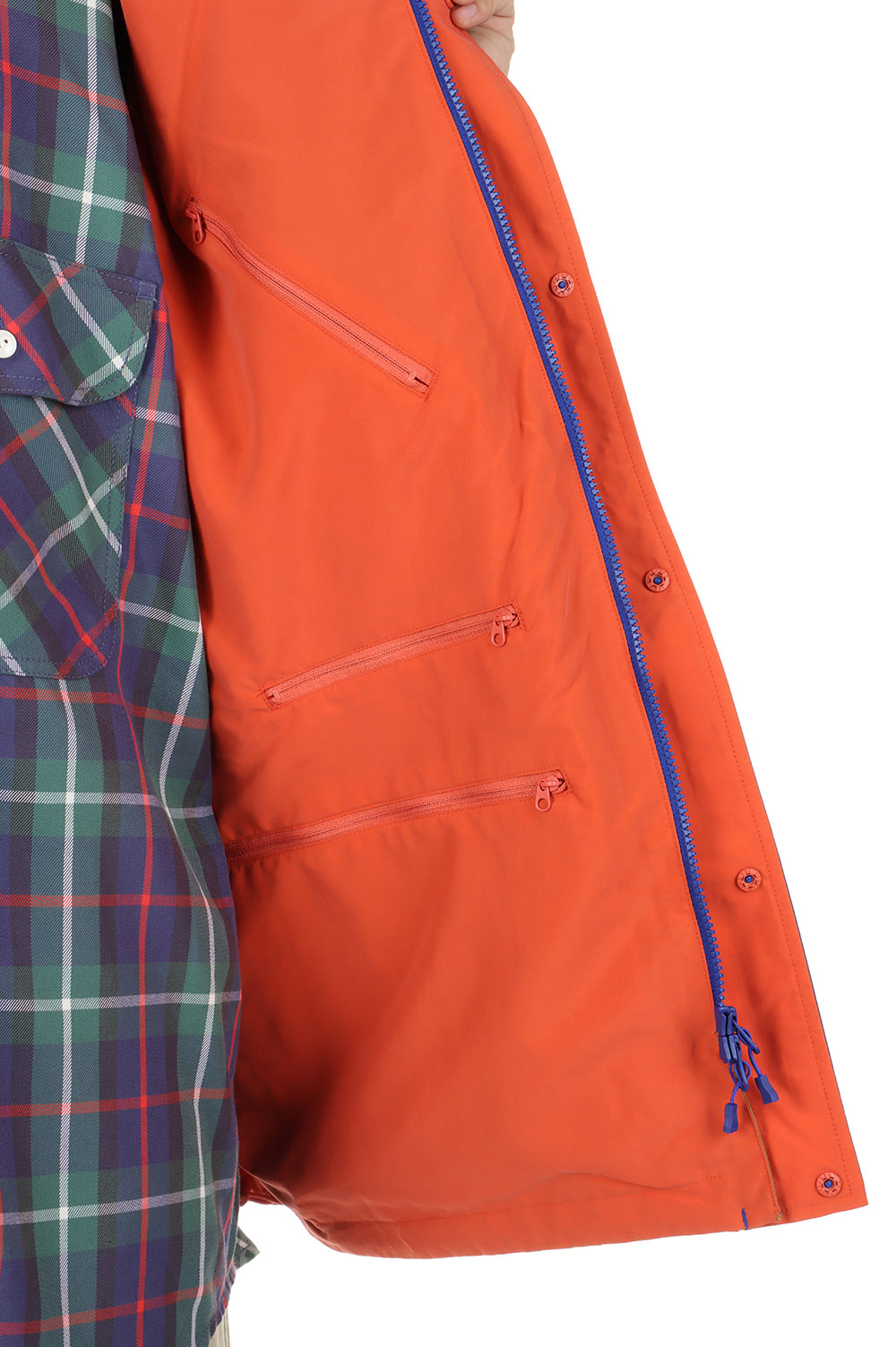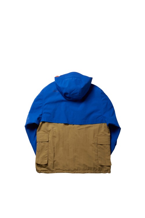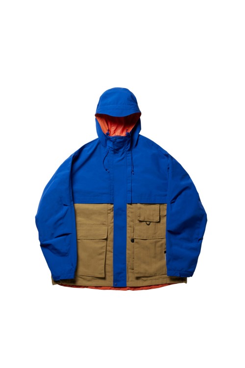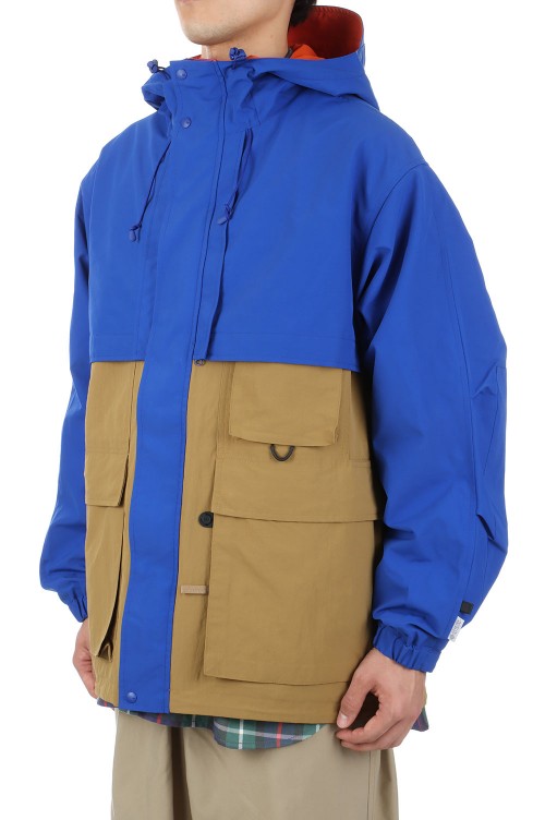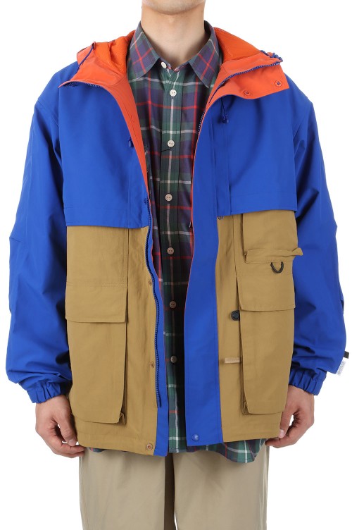 1990年代のアウトドアジャケットのカラーコンビネーションを彷彿させるギミック満載のアイテム。