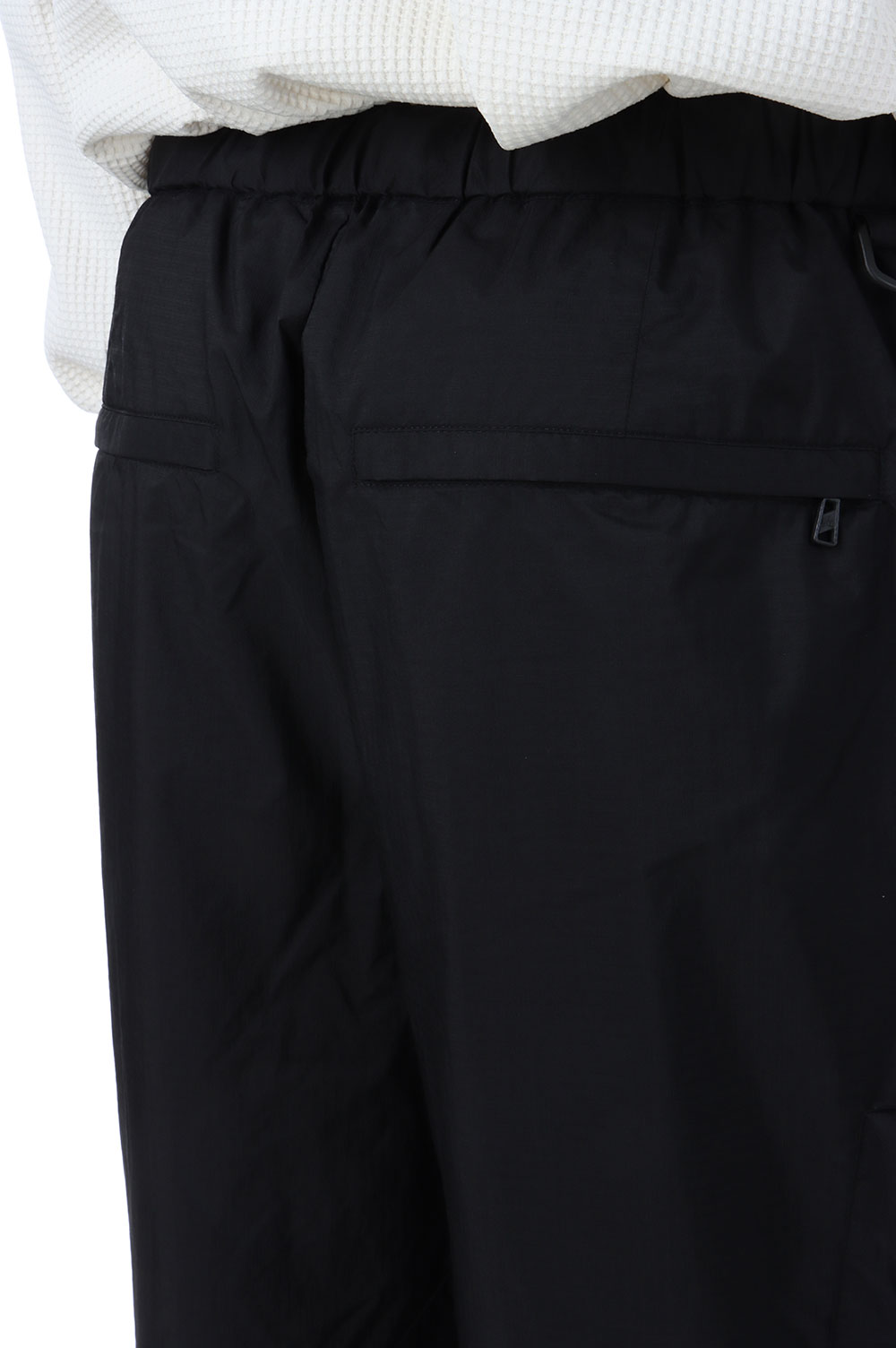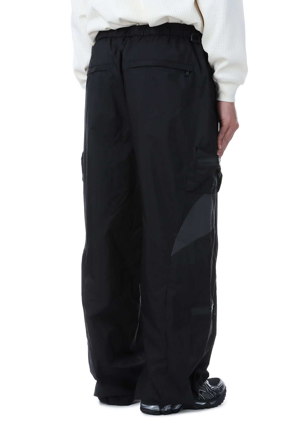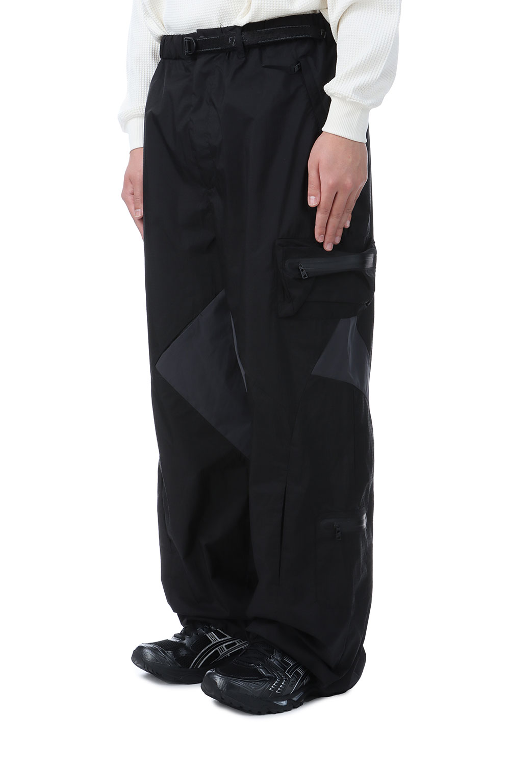 2.5レイヤー素材を使用したタック入りのワイドパンツ。